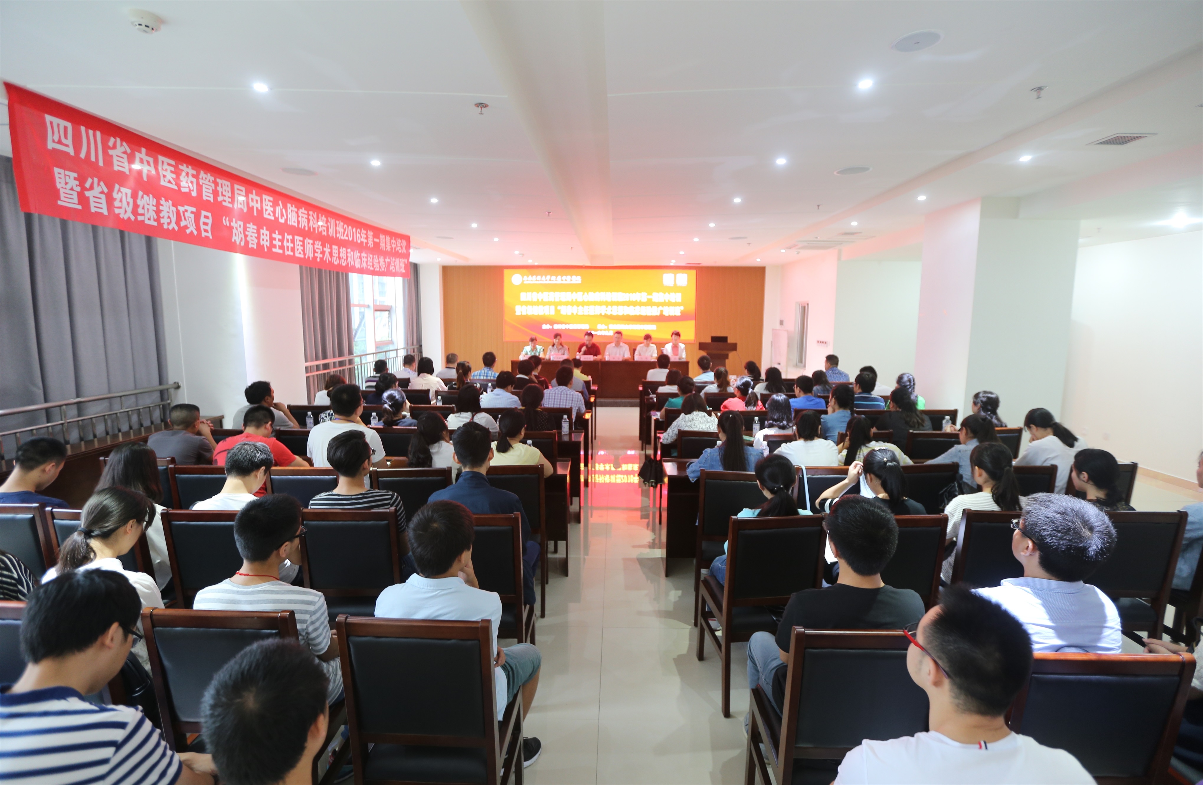 2016年9月5日,由四川省中医药管理局主办、我院承办的四川省中医药管理局中医心脑病科培训班2016年第一期集中培训暨省级继教项目“胡春申主任医师学术思想和临床经验推广培训班”隆重开班!我院党政领导及来自成都、绵阳、达州、遂宁、攀枝花等40余家中医医院的40余名从事心脑血管专业的医务人员参加了此次培训。培训班由西南医科大学附属中医医院大内科兼心脑病科主任白雪教授主持。