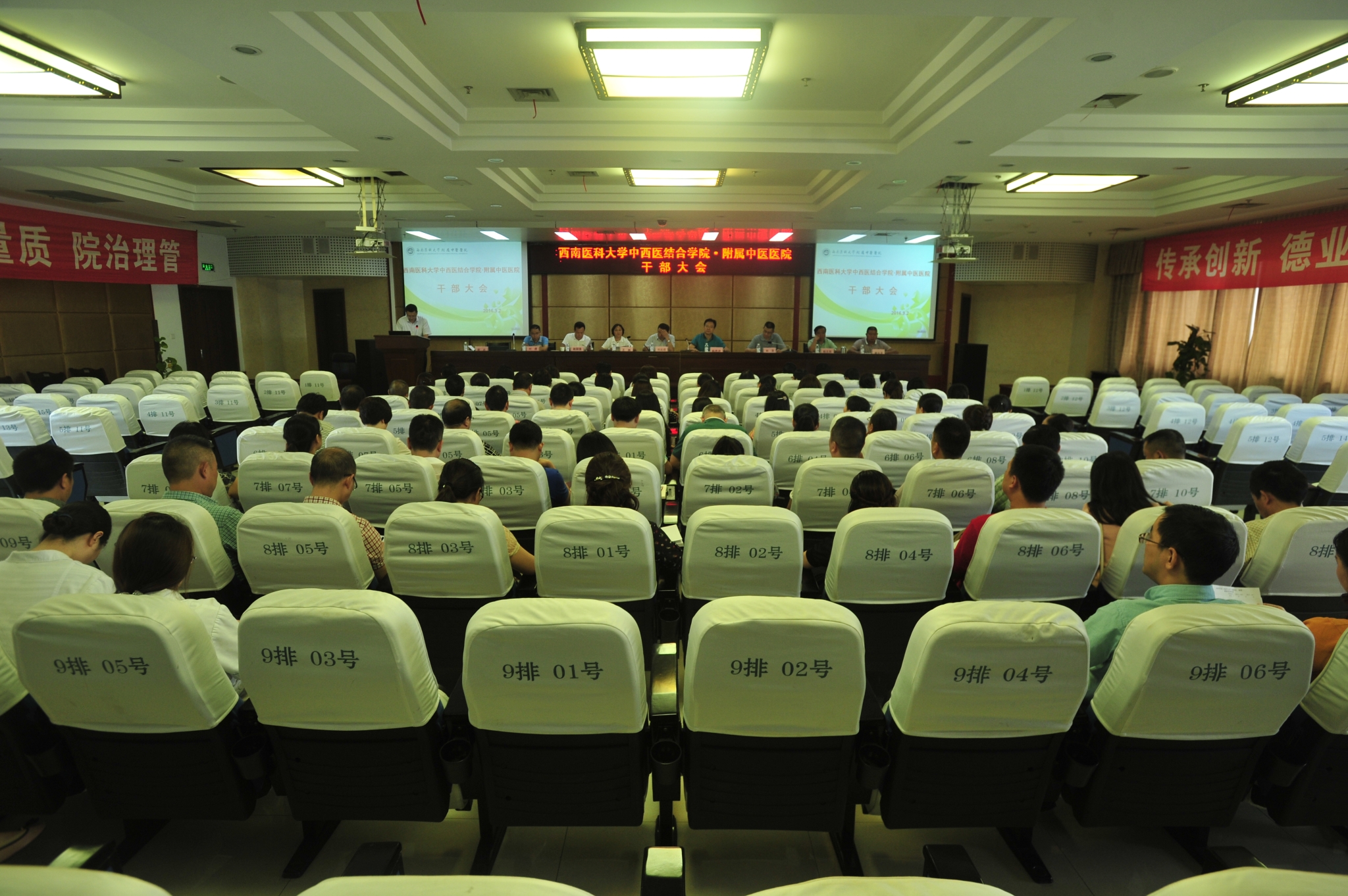2016年9月2日,我院在学海厅召开全院干部大会。学校校长何延政、党办主任林普,医院党委书记王琳等领导班子成员、科级干部、科主任、护士长等共计120余人出席大会,会议由医院党委书记王琳主持。
