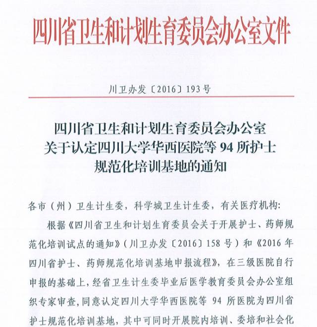 2016年8月8日,四川省卫生和计划生育委员会办公室下发了关于认定四川省94所护士规范化培训基地的通知,我院获批四川省2016年首批护士规范化培训基地。