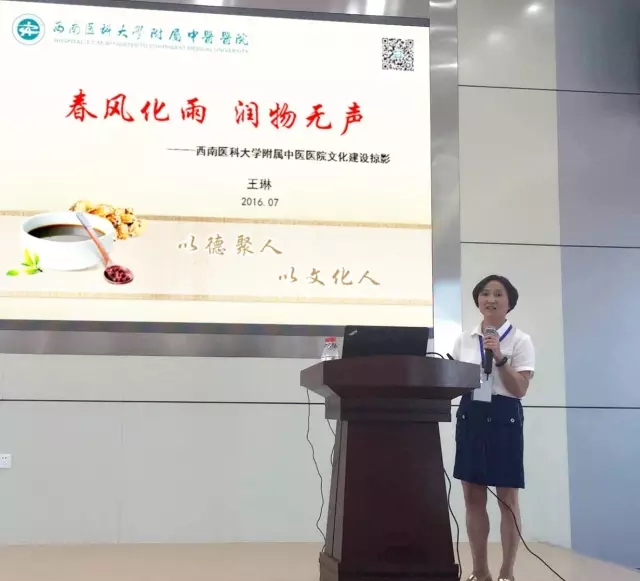 会上,王琳向与会人员介绍了西南医科大学附属中医医院基本情况后,从“理念文化,凝聚员工共识;环境文化,营造良好氛围;行为文化,激励员工奋进;人文关爱,构建和谐团队;勇担责任,彰显大医情怀”等方面介绍了医院文化建设工作开展情况,受到与会人员欢迎。