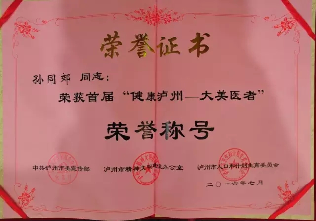 2016年7月6日,泸州市卫生计生系统 “健康泸州—大美医者”表彰大会隆重召开,我院肝胆病科孙同郊教授荣获“健康泸州—大美医者”荣誉称号,骨伤科(关节·足踝组)汪国友副教授、急诊科李光珍副主任护师、妇产科姚菲主管护师荣获“健康泸州—大美医者”提名奖。