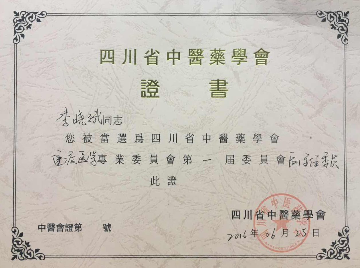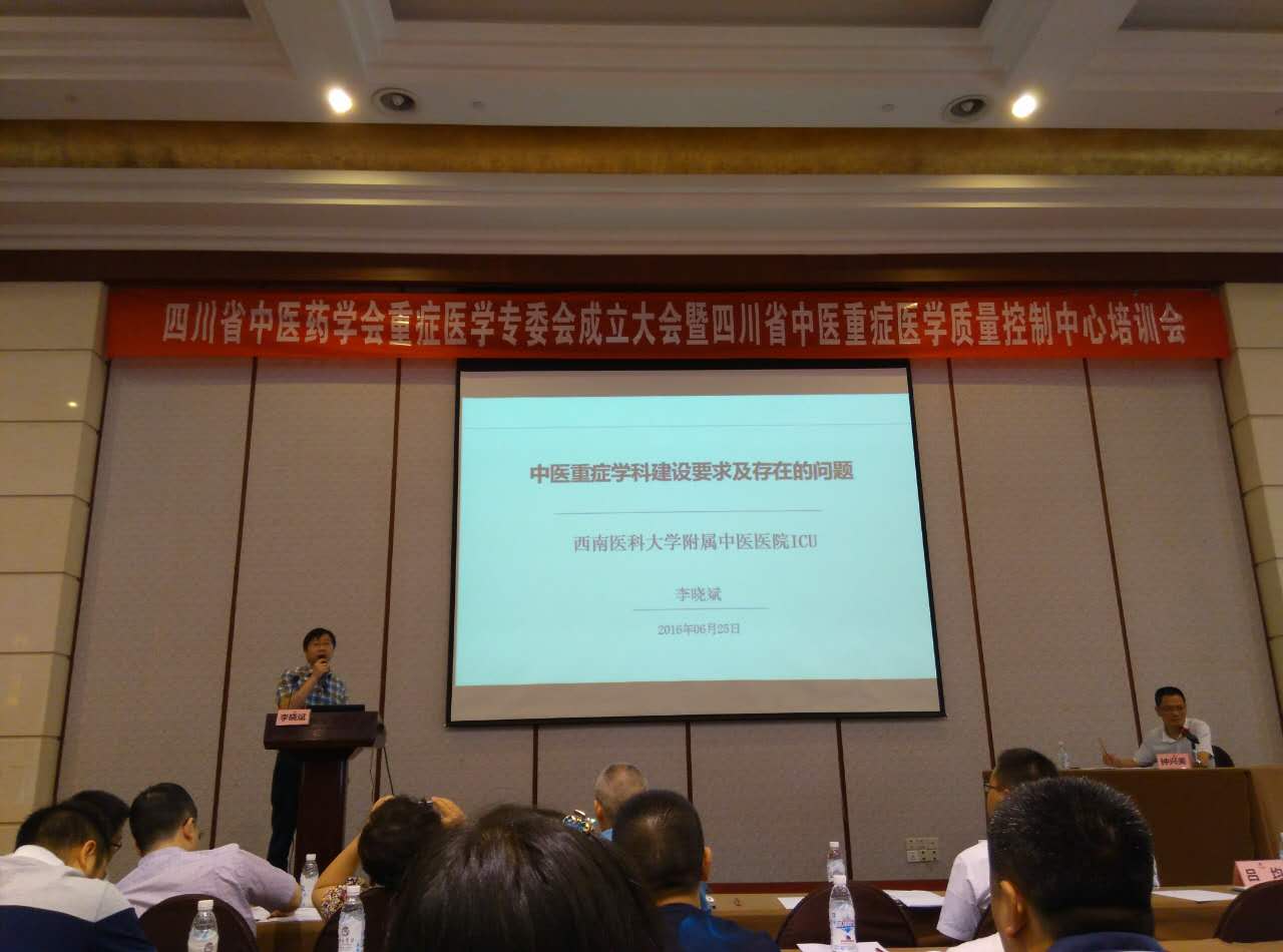 2016年6月24日至25日,四川省中医药学会重症医学专委会成立大会暨四川省中医重症医学质量控制中心培训会在成都召开,西南医科大学附属中医医院重症医学科主任李晓斌副教授当选为副主任委员,刘平医师当选为委员。 会上,李晓斌作了题为《中医重症医学科建设要求及存在问题》的专题讲座。