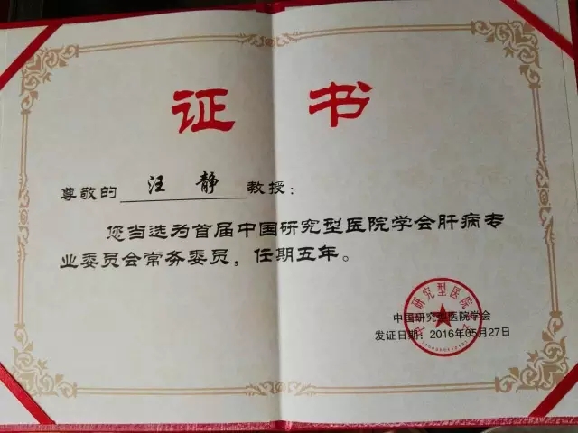 2016年5月27日,中国研究型医院学会肝病专业委员会成立大会在北京召开,我院大内科副主任、肝胆病科主任汪静教授当选为常务委员。
