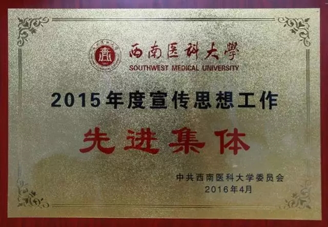 2016年4月28日,在西南医科大学2016年党建工作会暨“两学一做”学习教育动员部署会上,我院荣获“2015年度宣传思想工作先进集体”称号,副院长杨文信荣获2015年度处科级干部考核优秀个人和2015年党风廉政建设先进个人,宣传部张小玉荣获“2015年度宣传思想工作先进个人”称号。