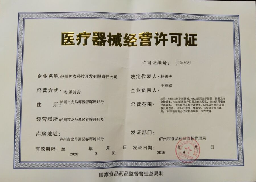 近日,泸州市食品药品监督管理局对泸州神农科技开发有限责任公司申请的第三类医疗器械经营许可进行了现场检查,泸州神农科技开发有限责任公司顺利通过验收,并取得第三类医疗器械经营许可。 除了日常的生活用品和养生保健产品之类,来泸州神农科技开发公司还能购买医用仪器设备、注射穿刺器械、诊疗室设备、医用高分子材料等。