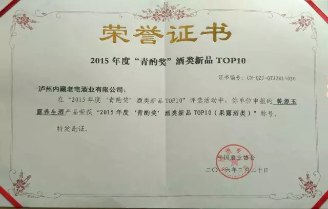 好消息!2016年3月20日,中国酒协2015年度“青酌奖”酒类新品TOP10发布盛典在泸州举行,我院研制的思进牌“乾源玉露”养生酒,经中国酒协严格评审,在全国200余件新产品中脱颖而出,摘得桂冠,被评为2015年度“青酌奖”(果露酒类)。