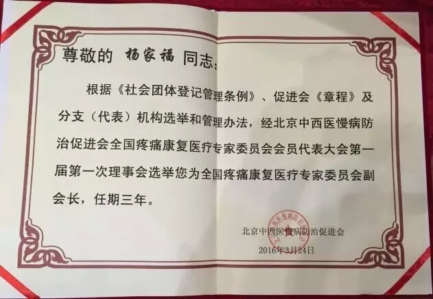 2016年3月24—26日,首届中华国医疼痛康复医学高峰论坛和全国疼痛康复医疗专家委员会会员代表大会第一届第一次理事会在北京召开,我院骨伤科杨家福教授当选为全国疼痛康复医疗专家委员会副会长。