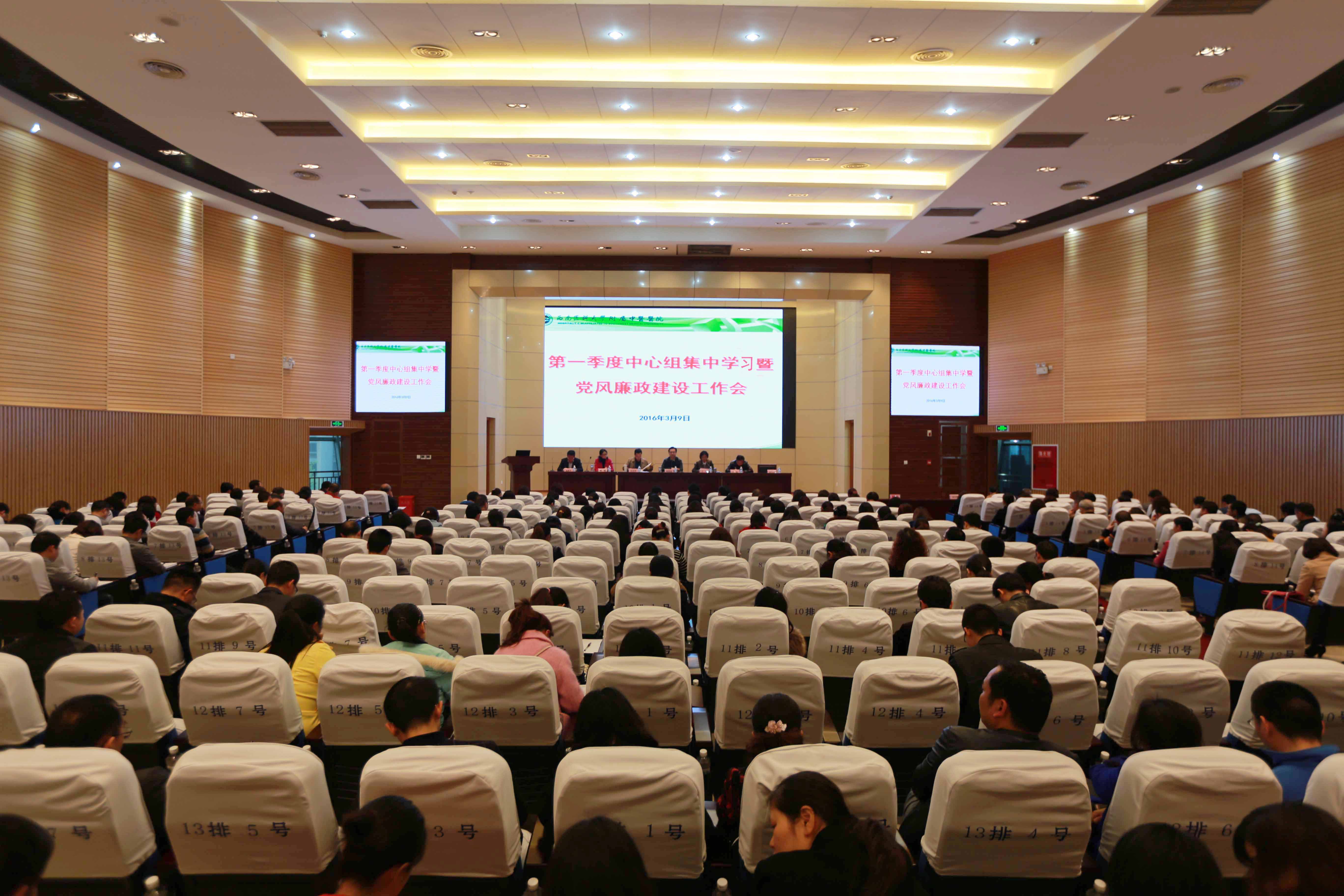 大会现场 2016年3月9日,我院召开2016年第一季度党委中心组学习会暨党风廉政建设工作会,全体院领导、党委委员、纪委委员、各党支部书记、职能部门负责人、临床科主任及助理和护士长及助理、重点岗位人员等共计200余人参加了会议。