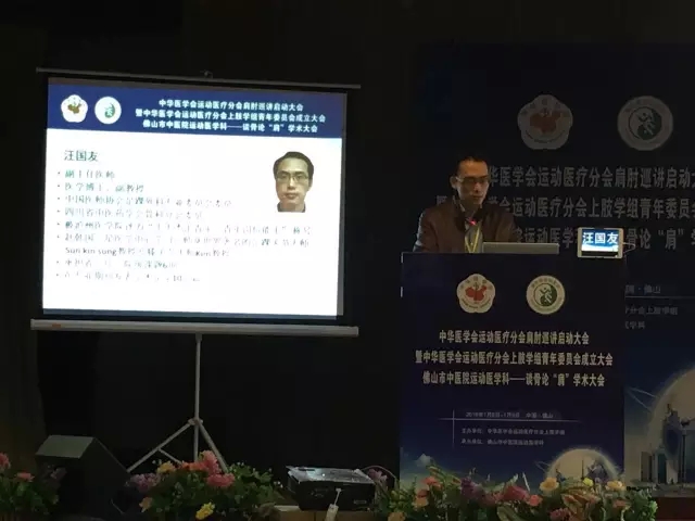 2016年1月8日-10日,中华医学会运动医疗分会肩肘巡讲启动大会暨中华医学会运动医疗分会上肢学组青年委员会成立大会在广东省佛山市召开。我院骨伤科(关节·足踝组)副主任、骨科博士汪国友副教授当选为中华医学会运动医疗分会上肢学组第一届青年委员会委员。会上,汪国友作了题为《肩关节锁定前脱位的治疗》专题讲座。