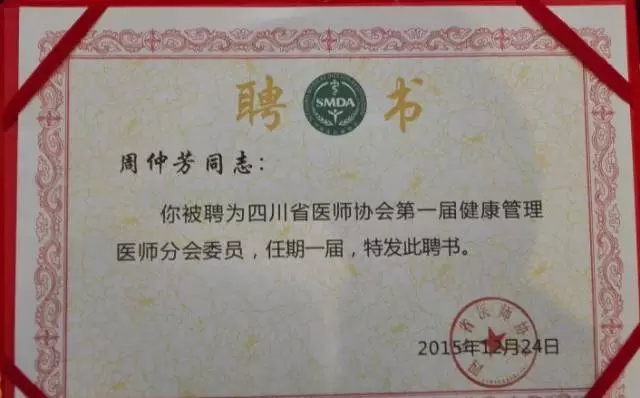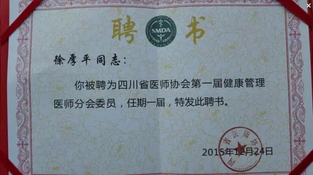 2015年12月24—26日,四川省医师协会健康管理医师分会成立大会暨慢性非传染性疾病的健康干预与适宜技术培训班在成都召开,我院院长助理、治未病中心主任徐厚平博士,体检中心副主任周仲芳副主任护师当选为四川省医师协会第一届健康管理医师分会委员。