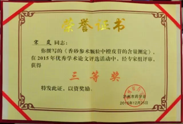 随后,会上选举了泸州市药学会第六届理事会理事、常务理事,四川医科大学附属中医医院药剂科主任赵福兰主任药师当选为副理事长,制剂室主任蒲清荣主任中药师当选为常务理事。同时,药剂科兼制剂室副主任赵剑主任中药师、副主任药师宋岚撰写的论文分别获得二等奖、三等奖。