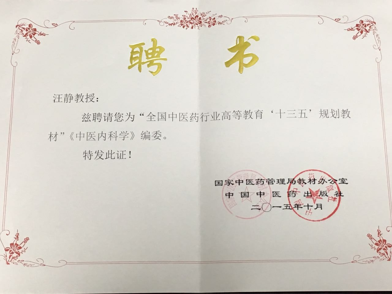 2015年11月29日-12月1日,我院大内科副主任兼肝胆病科主任汪静教授受聘为全国中医药行业高等教育“十三五”规划教材《中医内科学》编委。