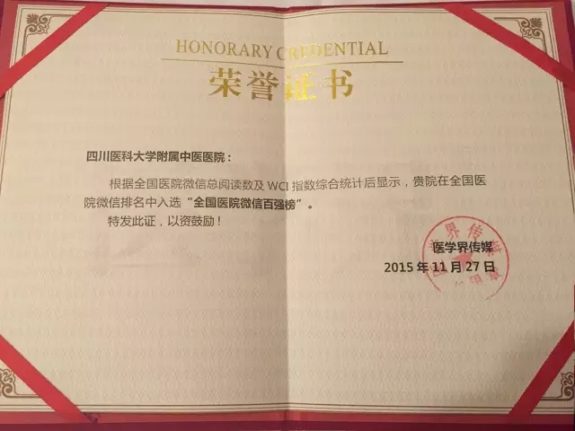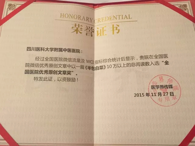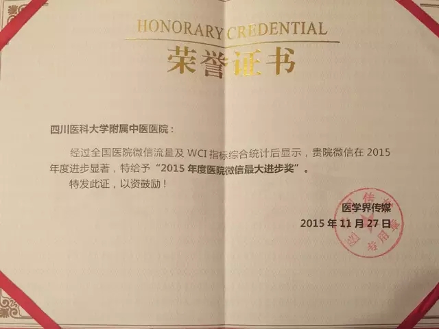2015年11月27日—28日,“互联网+”医院宣传新变局暨2015中国医院宣传年会在上海召开,我院入选“全国医院微信百强榜”,并荣获“2015年度医院微信最大进步奖”。同时,医院在全国医院微信优秀原创文章中以一篇《半包白菜》10万以上的总阅读数入选“全国医院优秀原创文章奖”。