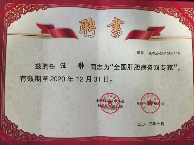 2015年11月10日,我院大内科副主任兼肝胆病科主任汪静教授被中国科学技术协会-吴阶平医学基金会专家委员会聘为“全国肝胆病咨询专家”。