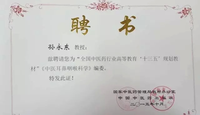 2015年11月9日—10日,全国中医药行业高等教育“十三五”规划教材《中医耳鼻咽喉科学》编写启动会议在广州召开,我院耳鼻喉科主任孙永东教授当选为编委。