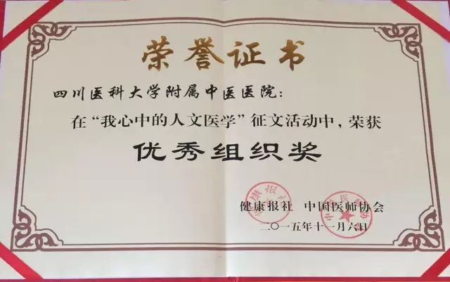 据悉,此次征文活动由健康报社和中国医师协会人文医学专业委员会联合举办,旨在围绕广大医务人员的临床实践,通过一件件真实案例的讲述,阐释人文医学丰富的内涵,促使医学回归人文,使“关心病,更关心病人”的人文理念真正落到实处。此次活动共收到征文500余篇,有包括我院在内的8家医院荣获优秀组织奖,其中一等奖3篇,二等奖7篇,三等奖20篇,优秀奖24篇。