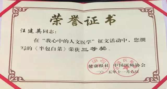 2015年11月5-6日,中国医师协会(2015)人文医学年会暨第十届走向人文管理高层论坛在厦门召开,我院荣获“我心中的人文医学”征文活动优秀组织奖,宣传部部长汪建英撰写的《半包白菜》荣获三等奖。