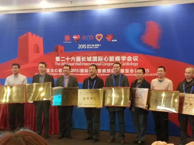 2015年10月31日,第二十六届长城国际心脏病学会议在北京召开。会上,相关领导对参加“国家‘十二五’重大专项H型高血压比较效果学研究”的全国41家合作医院进行了授牌仪式,我院心脑病科(心病组)主任助理潘洪副教授(左三)受大内科兼心脑病科主任白雪教授委托参加了授牌仪式。