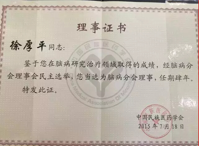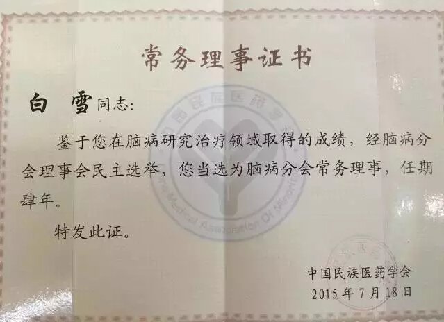 2015年7月17-18日,中国民族医药学会脑病分会成立会议暨2015中国中医民族医脑病学术交流会在北京召开,我院大内科兼心脑病科主任白雪教授当选脑病分会常务理事,院长助理、治未病中心主任徐厚平博士当选脑病分会理事。