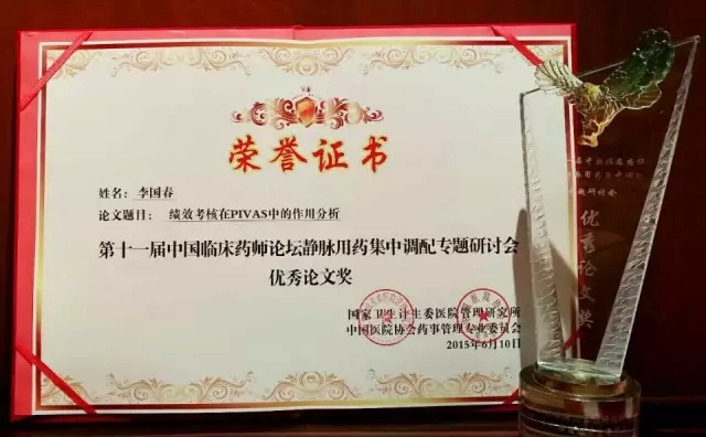 2015年6月10日,第十一届中国临床药师论坛静脉用药集中调配专题研讨会在安徽合肥举行,我院静脉用药调配中心主任李国春副主任药师,伍伦玲、陈晓霞药师等撰写的论文《绩效考核在PIVAS中的作用分析》被评为优秀论文。