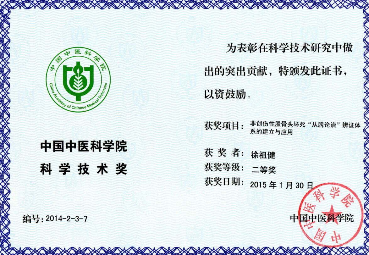 近日,我院骨伤科徐祖健教授的课题“非创伤性股骨头坏死从脾论治辨证体系的建立与应用”获中国中医科学院科学技术奖二等奖。