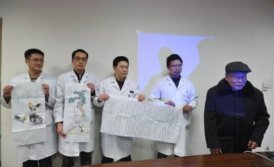 在活动中,患者成大爷还为我院骨伤科(关节组)医护人员送了三幅字画,以表达自己的感激之情。成大爷今年77岁,是泸县福集镇人,2013年3月在我院骨伤科做的右膝关节置换术。“2013年的时候我右腿痛的厉害,后听朋友说我院关节置换术开展得很好,我便慕名过来治疗。手术很成功,术后恢复也不错,现在完全可以像正常人一样走路了,非常感谢扶教授等医护人员们,他们不仅医术好,医德也好”。成大爷告诉记者。“我平时喜欢画画、写字,今天就想趁这次广大患者朋友都在场的机会,为他们送上自己的谢意。”