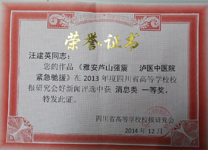 2014年12月,四川省高等学校校报研究会发文,泸医中医院宣传部部长汪建英撰写的《雅安芦山强震 泸医中医院紧急驰援》荣获2013年度四川省高等学校校报研究会好新闻消息类一等奖。