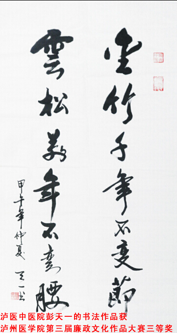 我院职工彭天一的书法作品《金竹千年不变节云松万年不弯腰》也在本次活动中获得三等奖殊荣。
