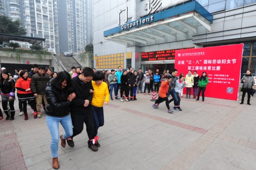 2014年3月6日,在“三八”国际妇女节即将来临之际,医院工会在城北新院门前广场举行了纪念“国际三八妇女节”职工同心协力接力赛。全院200余名职工共同观看了比赛,由医院各分会组成的8支参赛代表参加了比赛。