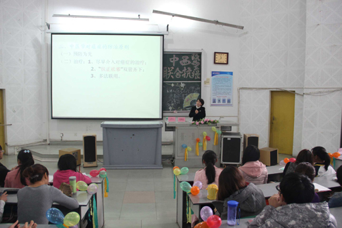 讲座中,赵春妮教授向大家介绍了癌症的定义、良恶性肿瘤区分标准、癌症发病的原因,通过实例阐述了中西医结合治疗癌症的重要性与必要性及优势,分析了乐观向上的心态对癌症治疗的重要性。她呼吁广大医务人员要帮助癌症病人端正对癌症的认识,树立抗癌信心,以减少病人痛苦,促进其尽快恢复健康。赵春妮希望广大医学生既要注重自身综合素质培养,又要不断提升自己人文修养。