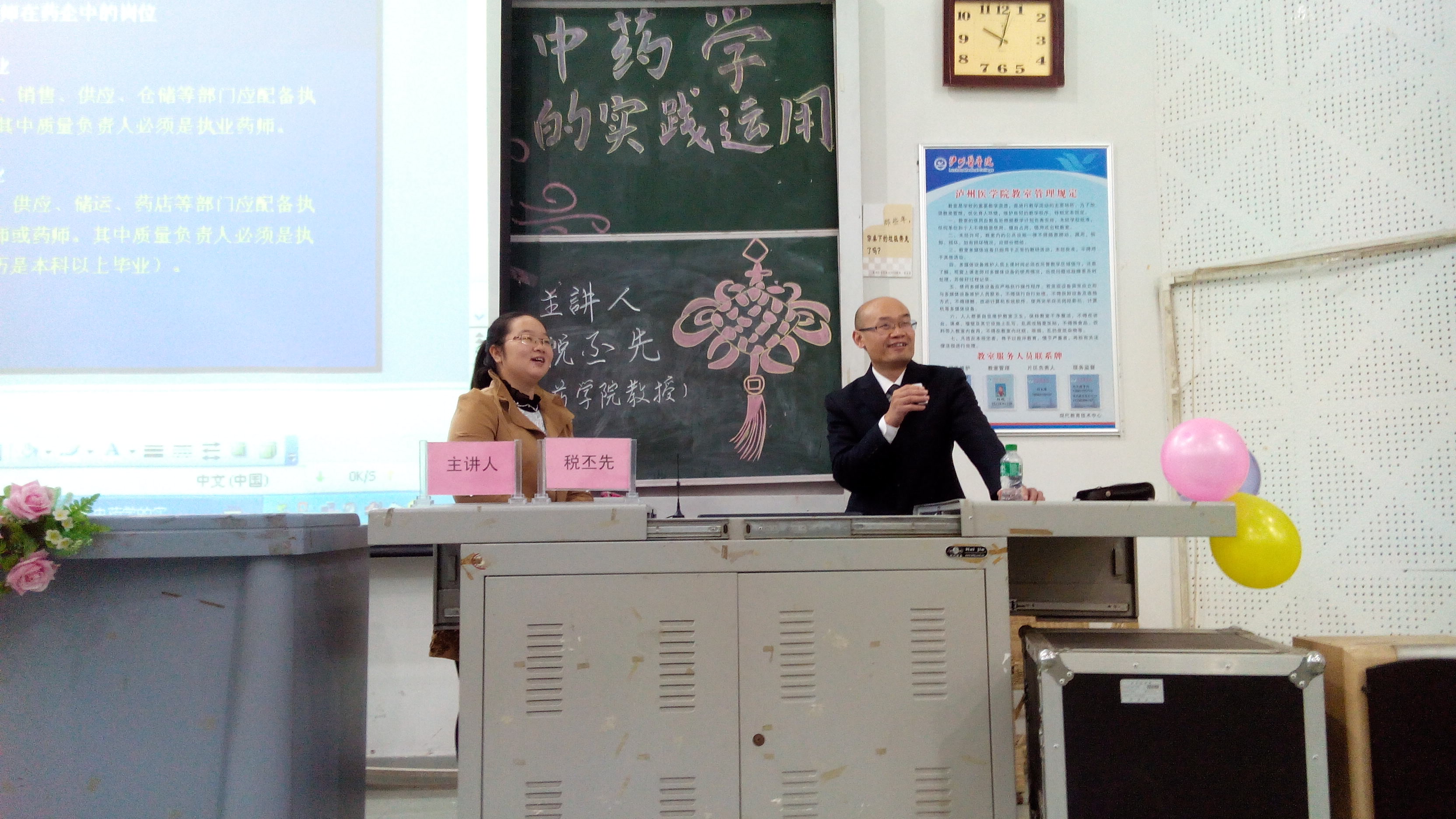 2013年11月3日,药学院税丕先教授应邀出席中西医结合学院、药学院联合主办的“百草堂杯”第五届中医药文化节之中医药文化大讲堂,做题为“中药学的实践应用”的精彩讲座。中西医结合学院与药学院350余名同学聆听了本次讲座。