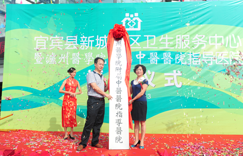 我院党委书记王琳向宜宾县新城社区卫生服务中心授“泸州医学院附属中医医院指导医院”牌。