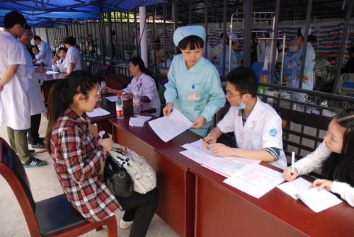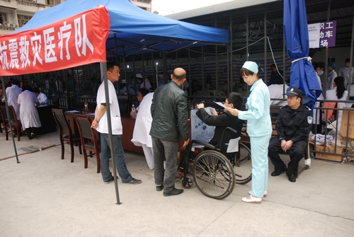 我院医护人员正在为伤员服务(右二为我院护士刘艳)