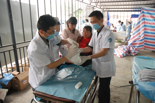 我院骨伤科副教授罗兵正在为伤员包扎(右一)