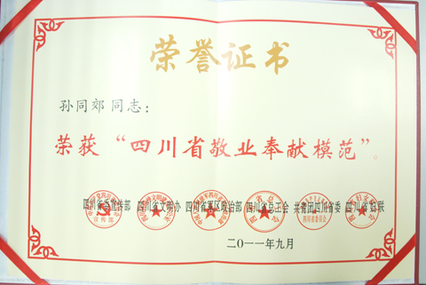 今年,四川省为集中展示公民思想道德建设的丰硕成果,扎实推进社会主义核心价值体系建设,大力培育文明道德风尚,充分发挥先进典型的示范引领作用,积极营造“两个加快”的良好社会氛围。由四川省委宣传部、四川省精神文明办、省总工会等6部委,联合在全省范围通过基层推荐,审核公示,群众投票,评委评选,并报省委、省政府领导同意,省文明委批准,共评选出“助人为乐”、“诚实守信”、“敬业奉献”等38位道德模范。我院退休教授孙同郊被授予“敬业奉献”道德模范称号,并受到大会表彰。
