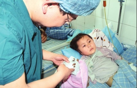 据了解,患者红红今年五岁,家住在合江县佛荫镇斯坝村,家境十分贫困,其母亲患有精神疾病。24日早上,其母亲病发时,用菜刀将女孩食指到尾指的四根手指齐根砍断。红红父亲得知情况后赶紧将女儿被砍断的4根手指用布和纸包好,奔向最近的一个乡镇卫生院,由于抢救条件有限,随后被转往泸医中医院救治。