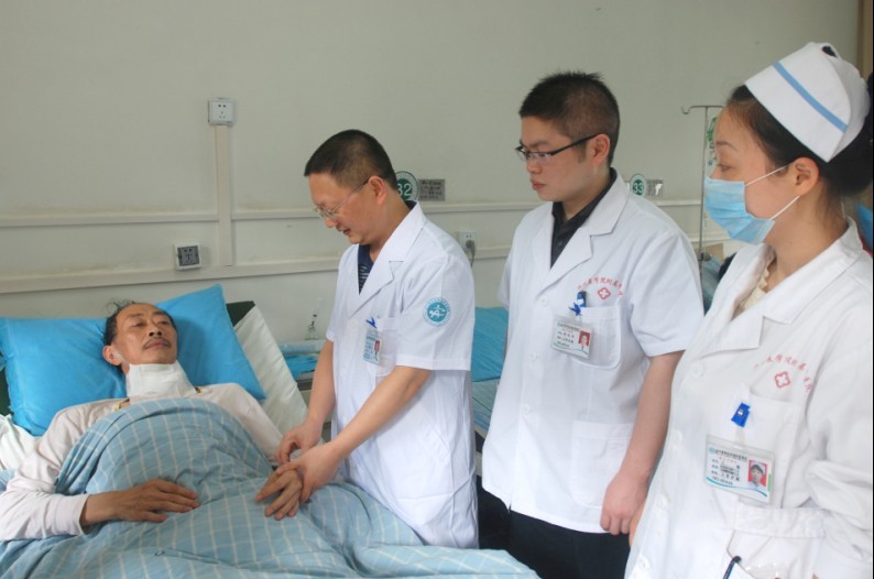 这位名叫王名权的患者,男,57岁,入院前1月感到严重呼吸困难,咽喉疼痛难忍,便慕名来到医院耳鼻喉科。经孙永东教授仔细检查,确诊患者得了喉癌,伴自发性气胸,生命垂危,孙永东教授立即组织胸心外科等相关科室进行会诊,经全面研究讨论,制定了手术方案,为他施行了 “喉癌喉次全切除术、胸骨舌骨肌带蒂喉功能重建术、环会厌下移吻合术、功能性颈清扫术”手术, 在孙永东教授的带领下,手术进行了一个多小时,完全切除肿瘤并对局部缺损进行了修复。术后采用穴位敷贴、中药离子导入、艾灸、中药汤剂等一系列中西医结合特色治疗和护理。在住院过程中,孙教授得知该患者经济困难,贷款进行治疗的情况下,组织全科医护人员主动为患者捐款两千余元。
