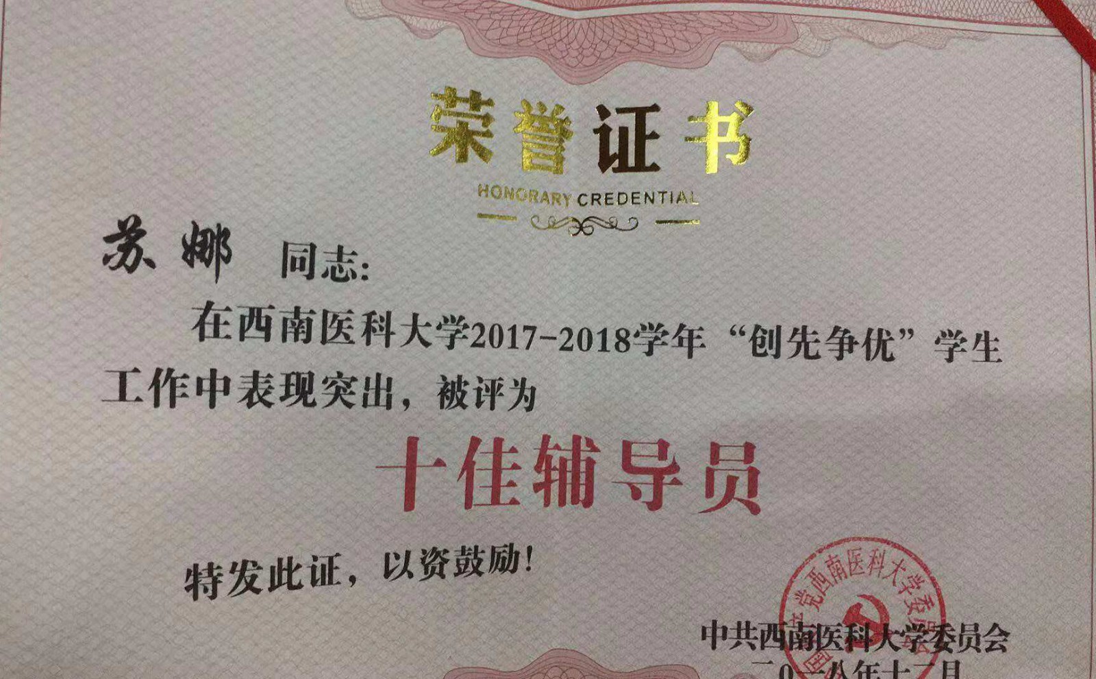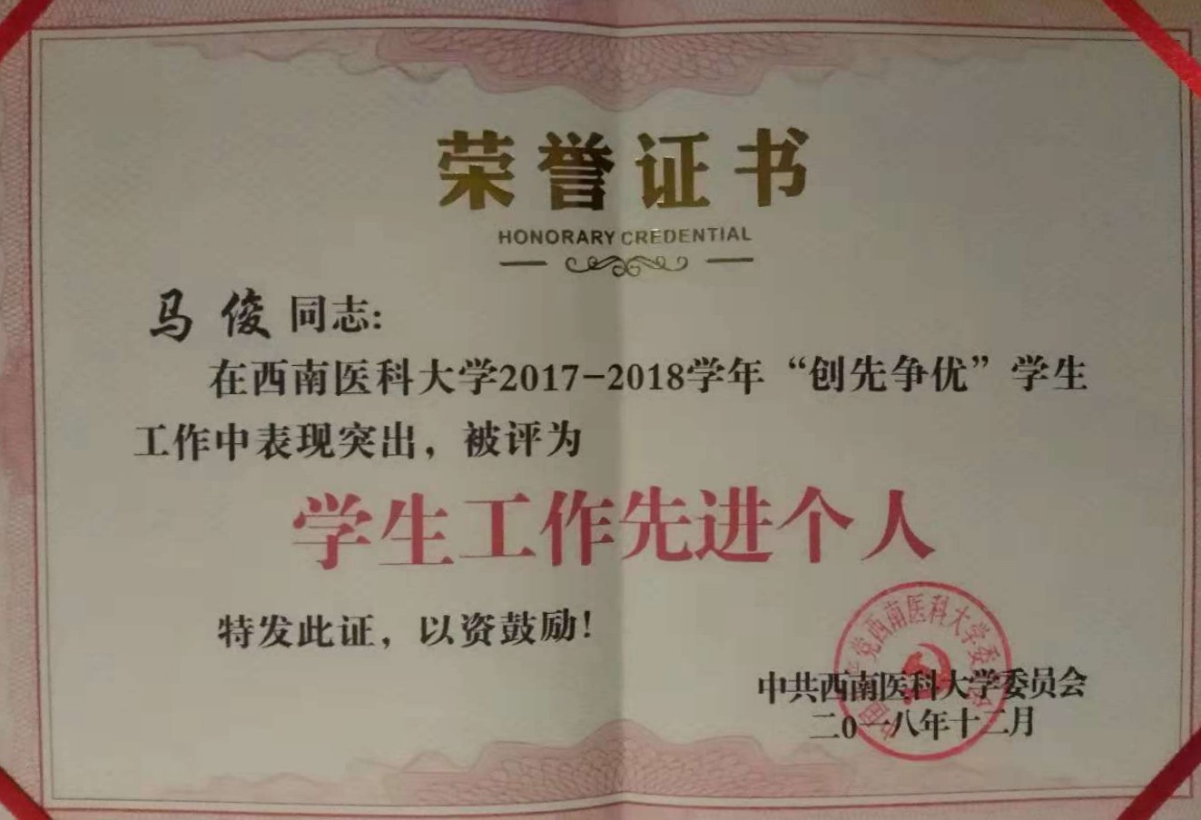 2018年12月6日,在西南医科大学“2017-2018学年创先争优”学生工作表彰活动中,中西医结合学院学生科科长马俊荣获“学生工作先进个人”荣誉称号,辅导员苏娜荣获“十佳辅导员”荣誉称号。