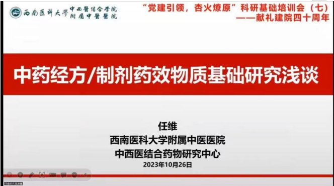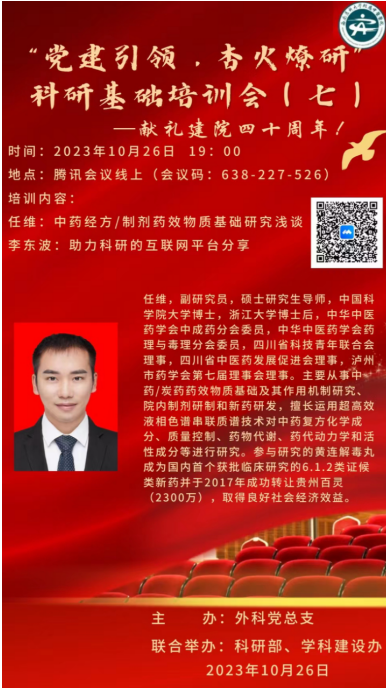 2023年10月26日,我院外科党总支联合科研部、学科建设办以线上形式开展了“党建引领 杏火燎研”科研基础培训(第七次)。会议邀请了医院中西医结合药物研究中心、中国科学院大学博士,浙江大学博士后任维副研究员,西南医科大学硕士研究生李东波分别以《中药经方/制剂药效物质基础研究浅谈》《助力科研的互联网平台分享》为题作了讲座,会议共50余人参加。