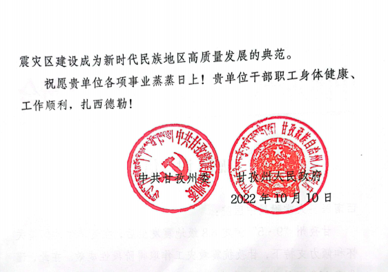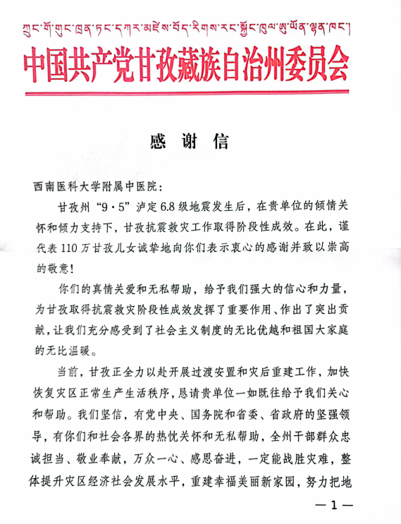 近日,中共甘孜藏族自治州委员会向我院发来感谢信,对我院在甘孜州“9·5”泸定 6.8 级地震救援工作中做出的贡献表示感谢。