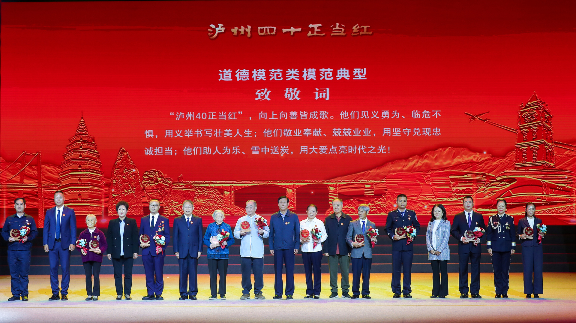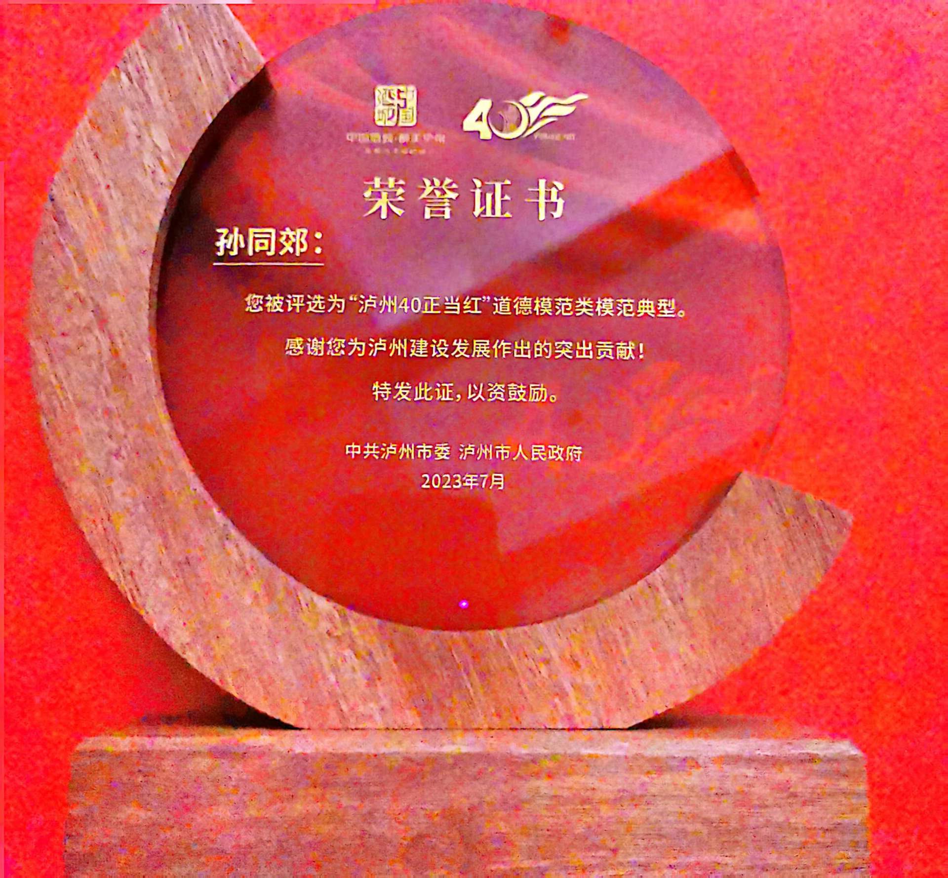 2023年10月23日,“泸州40正当红”群众文艺晚会在酒城大剧院举行。晚会现场,一批模范典型受到表彰,我院全国名中医、肝胆病科专家孙同郊教授荣获“道德模范类模范典型”称号。