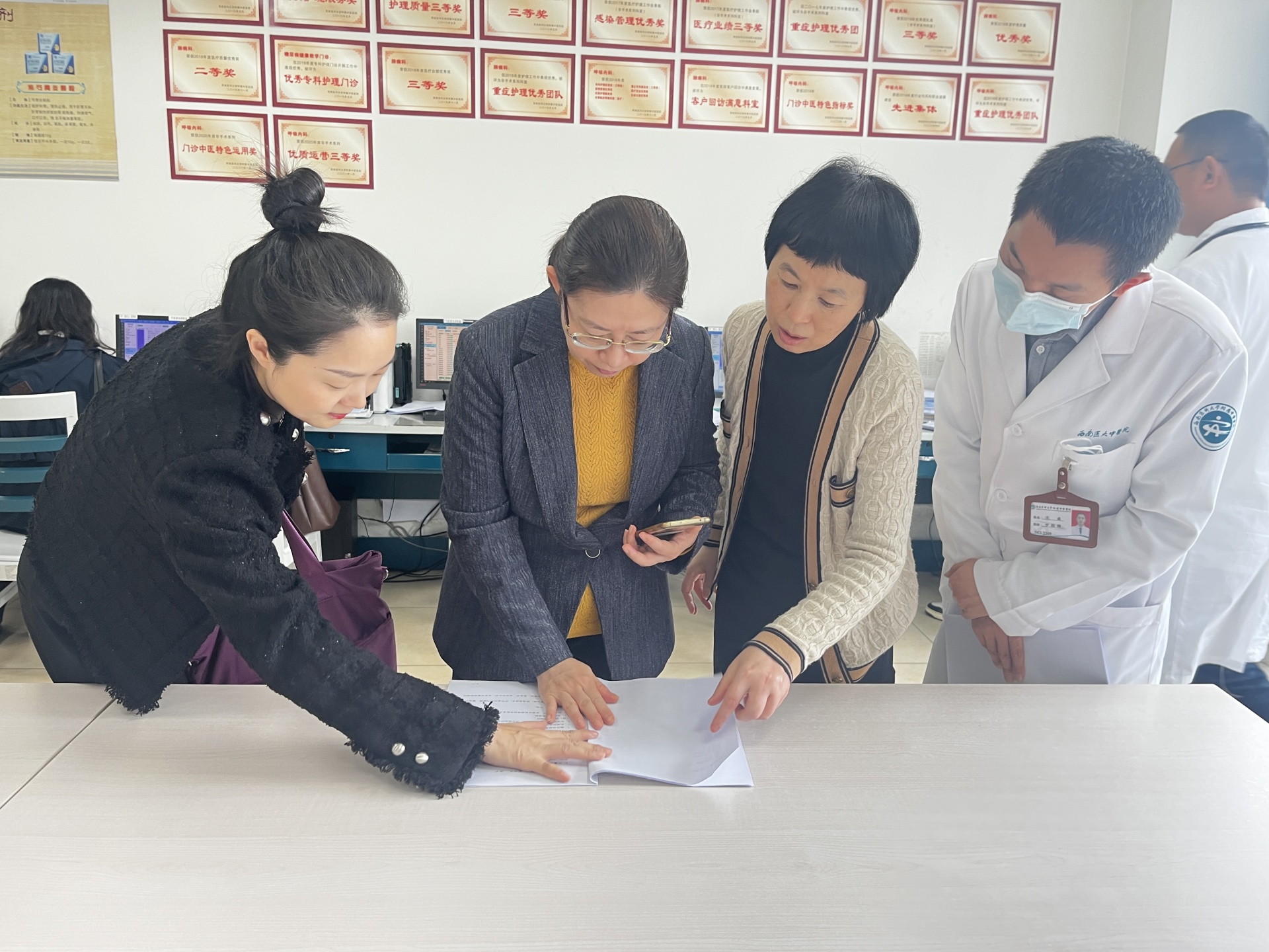 随后,四川省中医肺病质控中心业务主任陈云凤,质控专家王巍、曹栀、卿雯琪参观了中医特色诊疗中心、呼吸内科门诊、支气管镜室、肺功能室、呼吸内科病房,对优势单病种、临床路径的开展进行了质控指导。