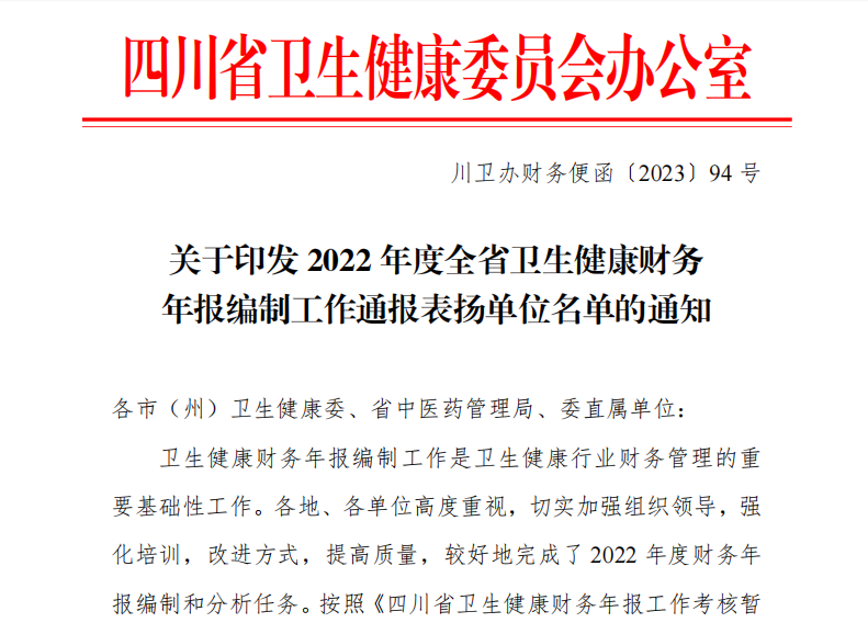 2023年11月1日,四川省卫生健康委员会办公室发布了《关于印发 2022 年度全省卫生健康财务年报编制工作通报表扬单位名单的通知》,我院荣获2022 年度全省卫生健康财务年报编制工作二等奖。