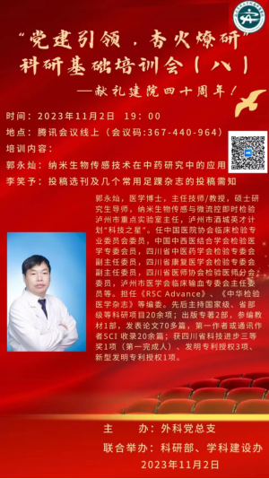 2023年11月2日,我院外科党总支联合科研部、学科建设办以线上形式开展了“党建引领 杏火燎研”科研基础培训(第八次)。会议邀请了医学博士、硕士研究生导师、纳米生物传感与微流控即时检验泸州市重点实验室主任、泸州市酒城英才计划“科技之星”郭永灿主任,西南医科大学硕士研究生李笑分别以《纳米生物传感技术在中药研究中的应用》《投稿选刊及几个常用足踝杂志的投稿需知》为题作了讲座,会议约50余人参加。