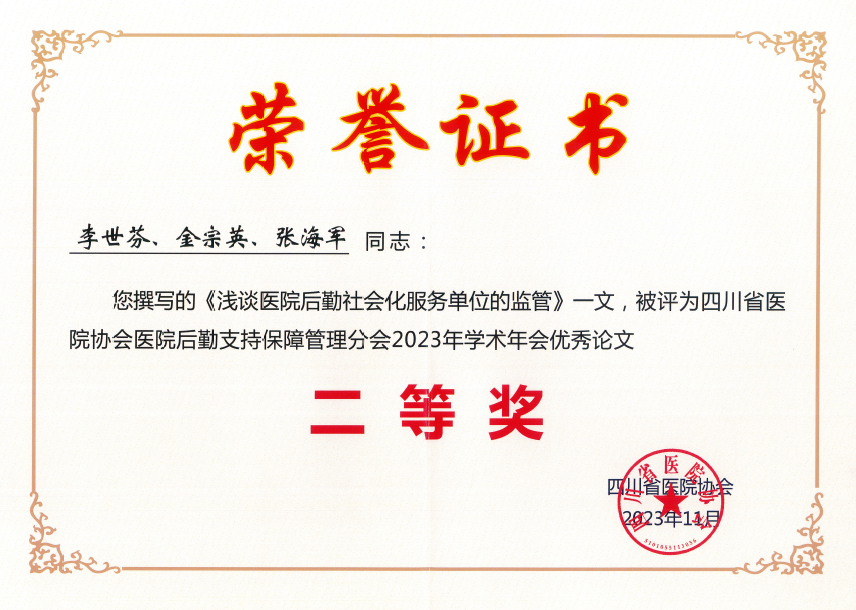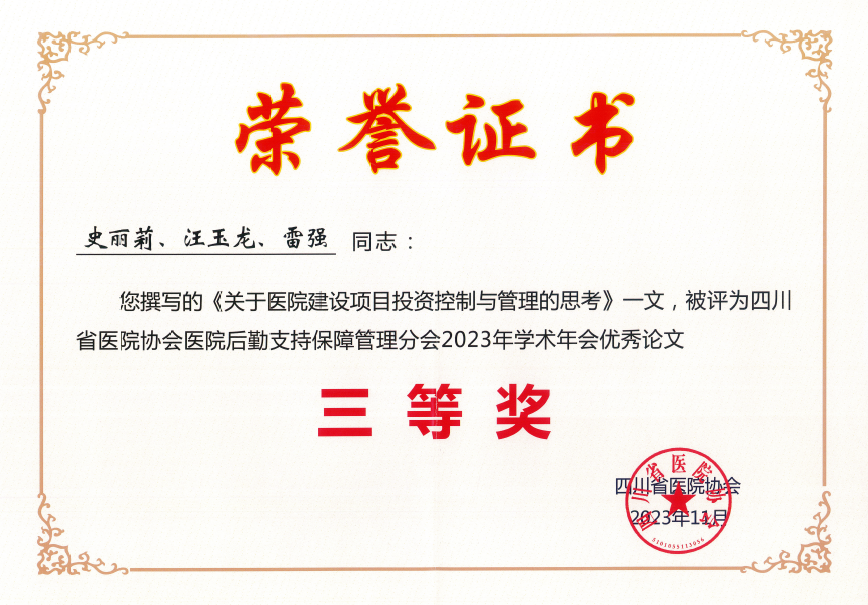 会上,我院获颁“2023年度医院后勤管理先进集体”称号;张建堂当选理事会副会长,并以《浅谈医院基建档案的规范化管理》为题作了讲座;刘辉宇当选理事会理事;李世芬、金宗英、张海军《浅谈医院后勤社会化服务单位的监管》撰写的论文荣获二等奖;史丽莉、汪玉龙、雷强撰写的论文《关于医院建设项目投资控制与管理的思考》荣获三等奖。
