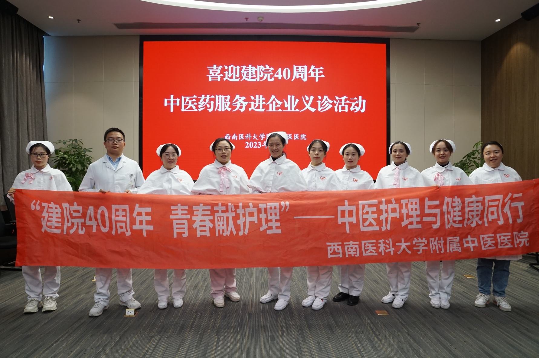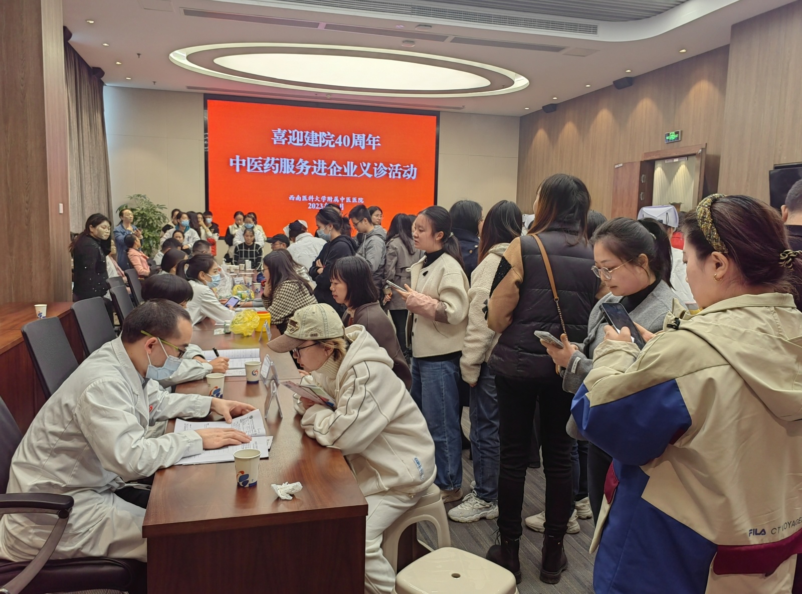 2023年11月15日,我院护理部、体检中心、客户服务中心、全科医学·VIP病房、内分泌代谢科、胸心外科等科室医护人员到泸州老窖集团有限责任公司开展了“建院40周年中医药服务进企业”主题义诊活动。