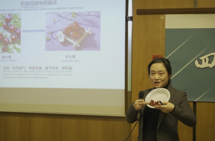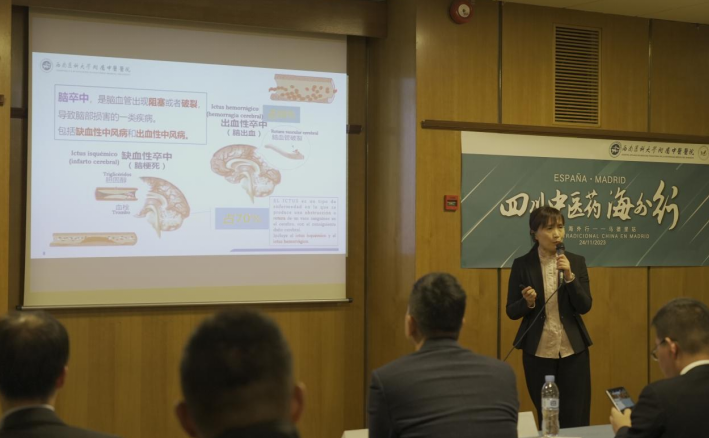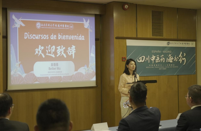 华侨华人协会副主席吴蓓蓓致辞。她表示西班牙华侨华人协会将助力中医药文化的传播,让更多西班牙民众了解四川中医药,通过中医药文化架起中西友谊之桥。