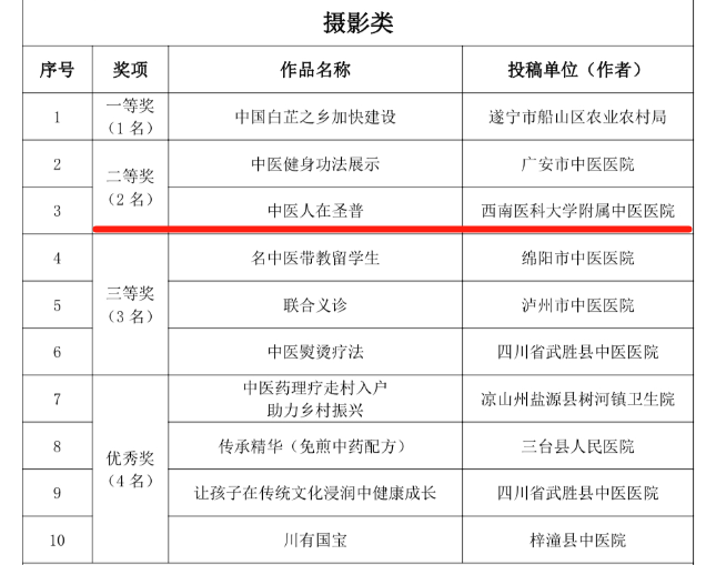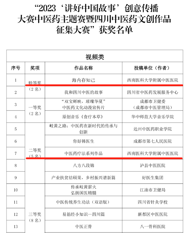 近日,四川省中医药管理局公布“2023‘讲好中国故事’创意传播大赛中医药主题赛暨四川中医药文创作品征集大赛”获奖名单,我院国际交流与对外合作部报送的《海内存知己》荣获视频类特等奖,《中医药疗法系列作品》荣获二等奖;感染管理办公室报送的《中医人在圣普》荣获摄影类二等奖。