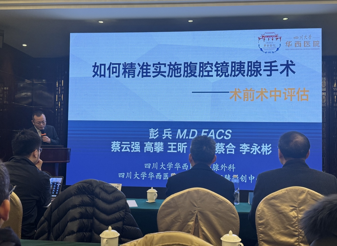 四川大学华西医院胰腺外科彭兵教授致辞,他介绍了四川大学华西医院胰腺外科发展概况,并分享了如何精准实施腹腔镜胰腺手术的经验。
