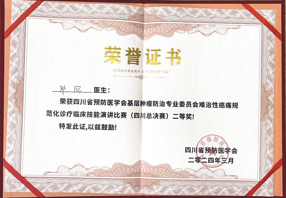 2024年3月10日,由四川省预防医学会基层肿瘤防治专业委员会组织的“2023首届难治性癌痛规范化诊疗临床技能演讲比赛(四川省总决赛)”在成都举行,来自成都、德阳、宜宾等8家医院代表参加了决赛,我院肿瘤·血液病科(忠山病区)邓凤医师荣获二等奖。